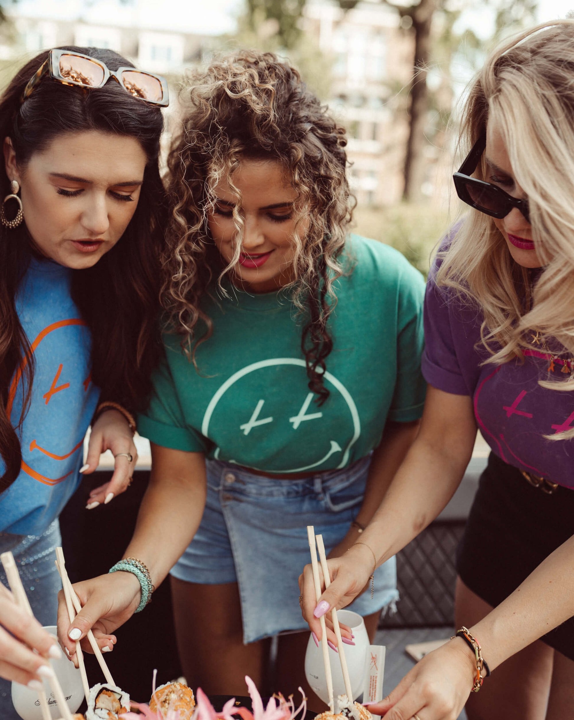 Yes, onze eerste Happiness collectie is nu te shoppen. Het 'Smiling All Day T-shirt' komt in zeven verschillende kleuren: oranje, roze, paars, blauw, grijs, beige en groen. Het T-shirt heeft een oversized fit met een gewassen uitstraling.